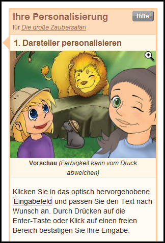 Here you you can then between four different books to decide. Each has a unique history and special features. We chose the book "The Magic Safari", because my daughter loves animals over everything and can play in this story, their house cat. Then simply click the appropriate book and you get to the area where you can personalize his book now.